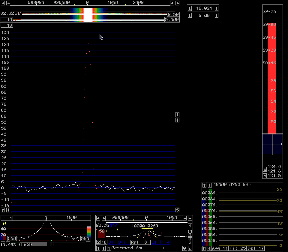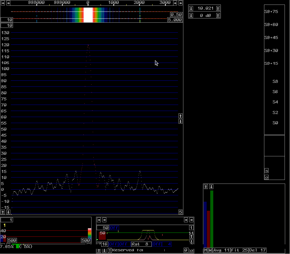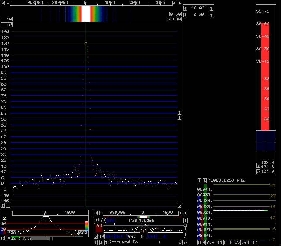 Note: A separate issue is that of measured signal or noise power within a defined sub-bandwidth of the total sampled digital signal, measured in dBfc/Hz. The theoretical minimum noise power measured in a channel in dBfc/Hz will be a 1Hz portion of the minimum theoretical noise present in the whole bandwidth (for a 16bit card at 48kHz): -6.02 dB x 16 bits - 3 dB - 46.8 dB = -141.92 dBc. A thoroughly misleading number :) 24 bit soundcards come in many flavours and qualities, none approaching the theoretical maximum. I have tested some mediocre ones and some pretty darn impressive ones. To use the same analysis as before, max dynamic range: 6.02 dB x 24 bits - 3 dB = 141.48 dB, lets shave 20 dB off this number for worst case realism: 121 dB. Worst-worst case soup of signals present: 121 – (46.8 – 34.8)) = 109 dB, not bad at all, corresponds to 18 S-units or a range of S0 to S9 + 55dB on our trusty S-meter. (48 kHz bandwidth, subtract additional 3 or 6 dB for 96 or 192 kHz) The above stipulates of course that your receiver gain has been adjusted to fit the soundcard capabilities. Add an input attenuator like those on commercial HAM radio superhets, and you are covered for all situations. I believe we now have a similar performer to those superhets, at least in terms of dynamic range. Below is a description of a simple test to determine the dynamic range of a Softrock 6.3/Mobo/24 bit soundcard setup. The soundcard used for this test was the SDR-Widget Lite (Alpha2). In order to take advantage of the dynamic range of this sound card, the audio amplifier loop gain in the Softrock 6.3 receiver was reduced by 25dB (R53 and 54 at 274ohm) . The PC was running Linux (kernel 2.6.35-rc3) and SDR software was Linrad by SM5BSZ (see also writeup on DDC receivers) A good quality ovenized 10MHz OCXO was used to inject a signal into the SR6.3/Mobo receiver. With this setup, the RF signal input was adjusted up to +4dBm, which was found to be the maximum level possible before the audio input to the audio card would go into distortion (break hopelessly apart). This would give just over 120dB Signal over the noise floor and very little noticeable increase in the noise floor itself (5dB). See the screenshot below which shows the signal in a +/-3kHz bandwidth. One of the first things apparent from this screenshot, and perhaps the largest surprise for me, was the superb phase noise performanc of the Si570 oscillator. The screenshot shows the noise floor at 3kHz out to be already down to approximately -118dBm. With this test, an input signal at +4dBm, some compression in the QSD circuit was noted. When testing with a slightly increased audio amplifier gain in the SR 6.3, with R53/R54 set at 499ohm (20dB decrease), the compression was found to be less at full level (now reduced to approx -1dBm) and the noise floor between 500Hz and 3kHz out to the side, was found to be almost flat. See here Below is another screen shot, this time also showing a second signal, 2kHz up, or at 10.002MHz. The second signal is 105dB weaker, or at -101dBm (2uV/50ohm). As can be seen, this signal is easily visible, a feat that is probably not repeatable by any superhet receivers within normal budget. As can be seen on this screenshot also, the -101dBm signal at 2kHz up is easily visible at about +15dB over the noise floor. However due to intermodulation in the QSD, caused by the very strong signal at 10.000MHz, an image at a weaker strength is also visible at 2kHz down. Hey, we are up to a dynamic range of S9 +74dB One of the weaknesses of the Soundcard based SDR is the I/Q modulation/demodulation scheme which requires a near constant 90 degree phase difference across a large spectrum of input frequencies. Any errors will affect the image suppression and in the worst case, an almost equal strength mirror image will be produced. Errors can be compensated for in the SDR software, but this can be cumbersome if the errors vary much across the HF band as well as across the audio input band. Also, any inequalities in the analog path before the A/D, especially in cheaper audio cards, may introduce inequal signal amplitude or inequal group delays (frequency dependent phase errors) between the two input channels, not to mention phase errors and jitter that may be introduced as well. A good soundcard will however in practice overcome all of those errors, except of course the errors introduced in the I/Q demodulator itself, those can be addressed by the SDR software. In practice it appears not difficult to achieve image suppression of 60 dB or more. Lack of crystal filters in an SDR:Crystal filters are simply narrow band mechanical filters. These introduce group delays (frequency dependent phase delays), especially if they are very narrow. This phenomenon is experienced as “ringing”.In an SDR implementation you will normally see an Infinite Impulse Response (IIR) filter or its more computationally intensive brother, Finite Impulse Response (FIR) filter, used. An IIR filter utilizes feedback, a sharp filter can be implemented with not too many poles, similar to an analog filter. This filter also introduces group delays, similar to an analog filter. A FIR filter however, does not implement feedback, does not cause group delays, but requires more iterations and is therefore more resource intensive. With a FIR, a near brick-wall like filter can be implemented, the penalty (there is always one) being signal processing delays. In conclusion, a filter implemented through DSP techniques is no worse than a crystal filter, and can be made better. DDC receivers simply sample the RF at the antenna output and the same holds true as before, the receiver needs to separate a -often very weak- RF signal from the sum total of -often very large- signals present at the antenna input. Most of the currently very popular DDC receivers on the market now use 14 bit A/D and some use 16 bit A/D. This limitation can be improved by bandwidth decimation which will increas