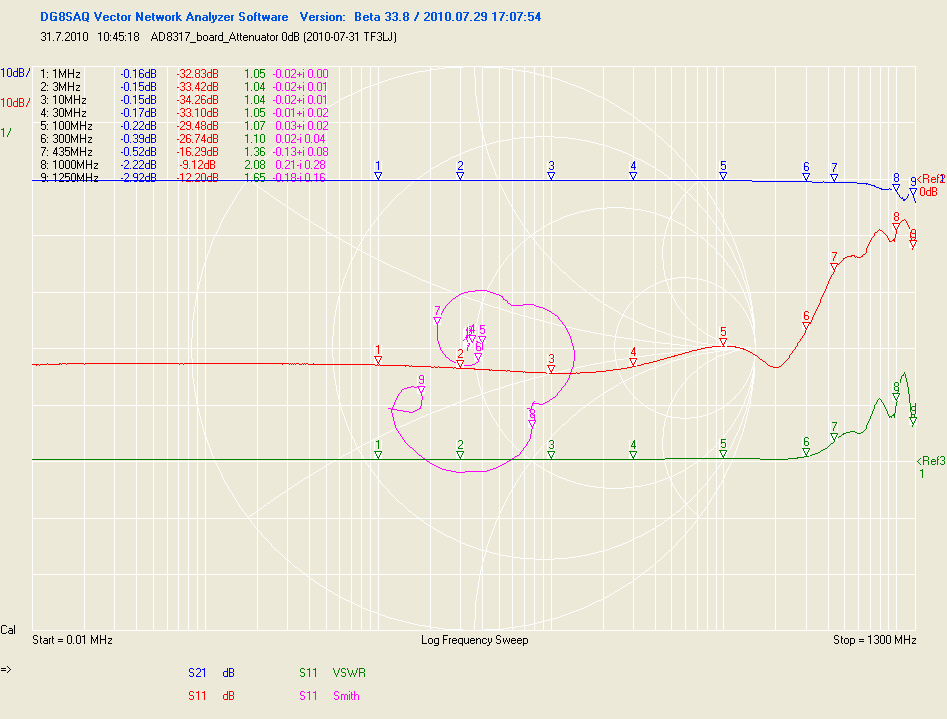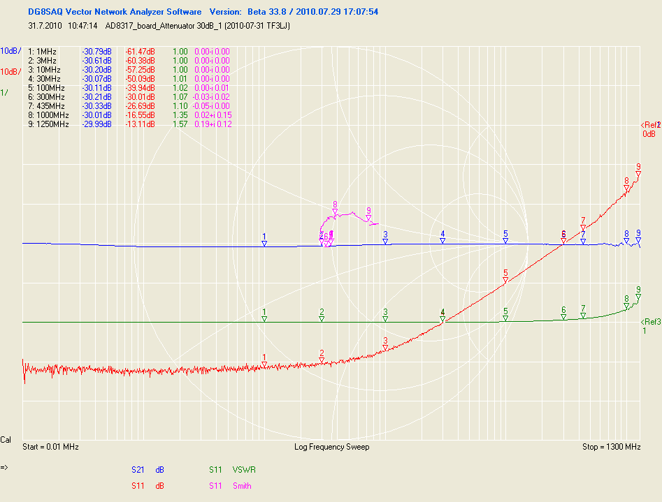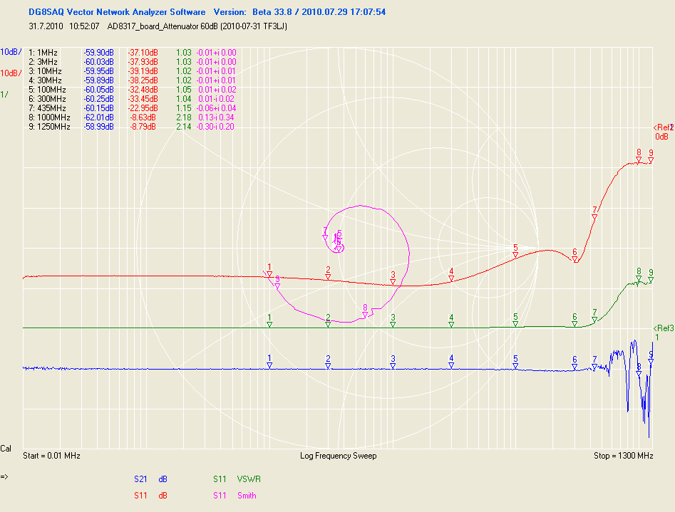 Below are VNA plots of the attenuator board. Â As can be seen, the attenuators are spot on at 30.0 and 60.0dB and the circuit performs well up to about 500 MHz, above 500 MHz things start to fall apart. Â It should be easy to extend the range up above 1GHz by using proper 50 ohm relays, 30dB SMD attenuators rather than the PI-R arrangement, and possibly an improved PCB layout. Â Four plots below, the first one with no attenuator in the circuit, the second with the first 30dB attenuator, the third plot has the second 30dB attenuator in the circuit, and finally the fourth plot has the 60dB attenuator in the circuit.