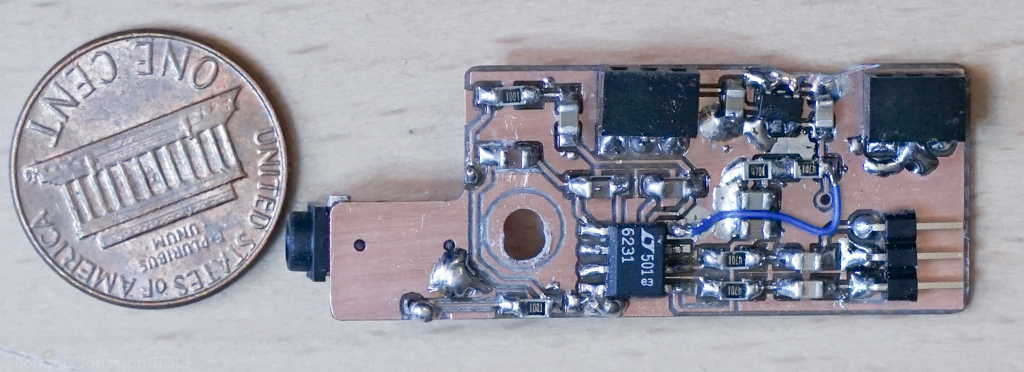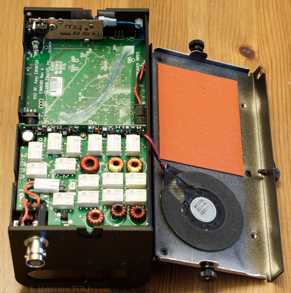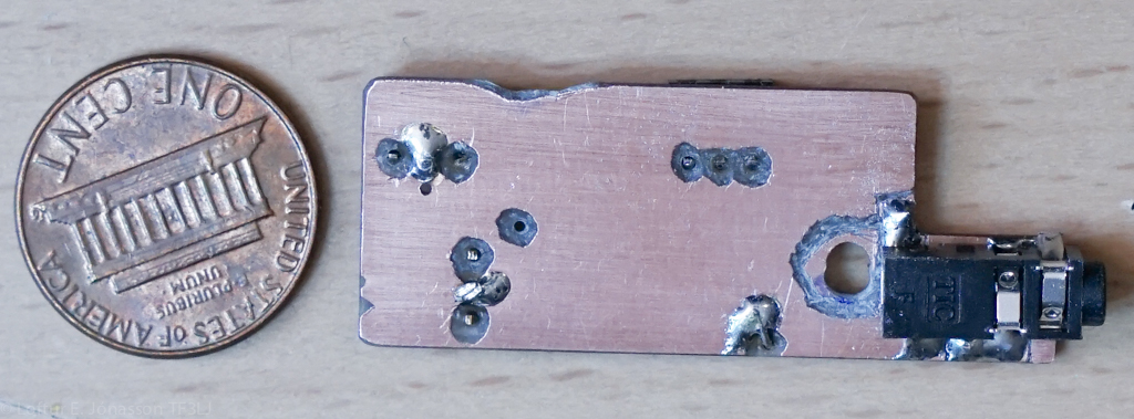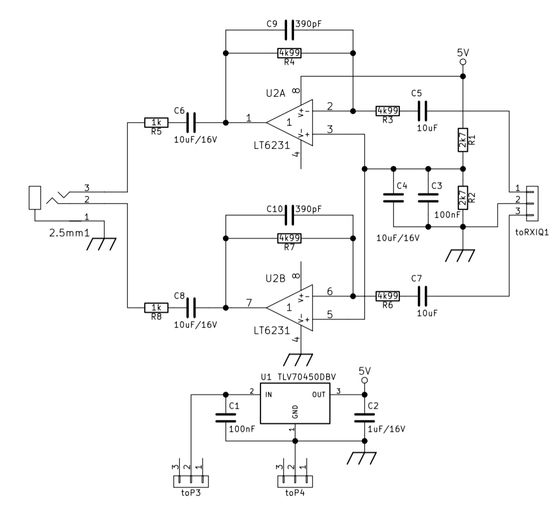 A mini writeup of an ill-conceived little project, adding a homemade option board to the Elecraft KX2 transceiver. Not all my projects are necessarily based on a good idea.  The below project is not something I wouldencourage anyone to do, it will certainly void any warranty on your shiny new KX2.  You have been warned J  Unlike the KX3, the KX2 does not have anaudio I/Q output for use by a Spectrum Scope or by external SDR software. However, this is actually rather easy to add,the signals are readily available, see: It is not advisable however to connect anexternal circuit directly to those outputs.  We certainly don't want to introduce hum or static to the signal path and any impedance mismatch introduced between the I and Q signals will trash the performance of the receiver, hence we need an isolationcircuit: (click on schematic to enlarge) No magic here, two unity gain amplifiers,in fact a somewhat similar circuit to the one used for the IQ output in theKX3.  C9 and C10 provide a gain rolloff forhigher frequencies than we are interested in. Initially I tried without C9 andC10, this resulted in an audible overdrive condition from time to time, presumably caused by a high frequency component present at the I and Q taps. This overdrive condition was especially notable when turning the VFO.  The 390pF capacitors however, provide a 6 dB cornerfrequency at approx. 80 kHz. This isprobably a tad bit more aggressive than necessary, but in any case, there isalready more rolloff present at the KX2 IQ outputs themselves.  More on this later.  Here is the new circuit, plugged into theoption slot of the KX2: (click on image to enlarge) Another angle: (click on image to enlarge) And here is the printed circuit board,rather miniscule J (click on image to enlarge) As I mentioned above, C9 and C10 were notincluded at first, here they are riding piggyback on top of R4 and R7.  Backside: (click on image to enlarge) As can be seen, the layout certainly has its share offlaws, I will not be making it available – so please don’t ask.  And here we have the new KX2 Audio IQoutput wired up to a computer running HDSDR, works like a charm. Notice the audio roll-off slope to the sides,appears to be close to 20 dB per 50 kHz, apparently the main contributor beingroll-off circuitry in the KX2, before feeding the AD inputs to the DSP. This is probably the reason Elecraft decidednot to provide an IQ output. I would love to see a schematic of the KX2. Anyway,even with this roll-off, it is still perfectly useable. (click on image to enlarge) Elecraft, get the hint? J  |