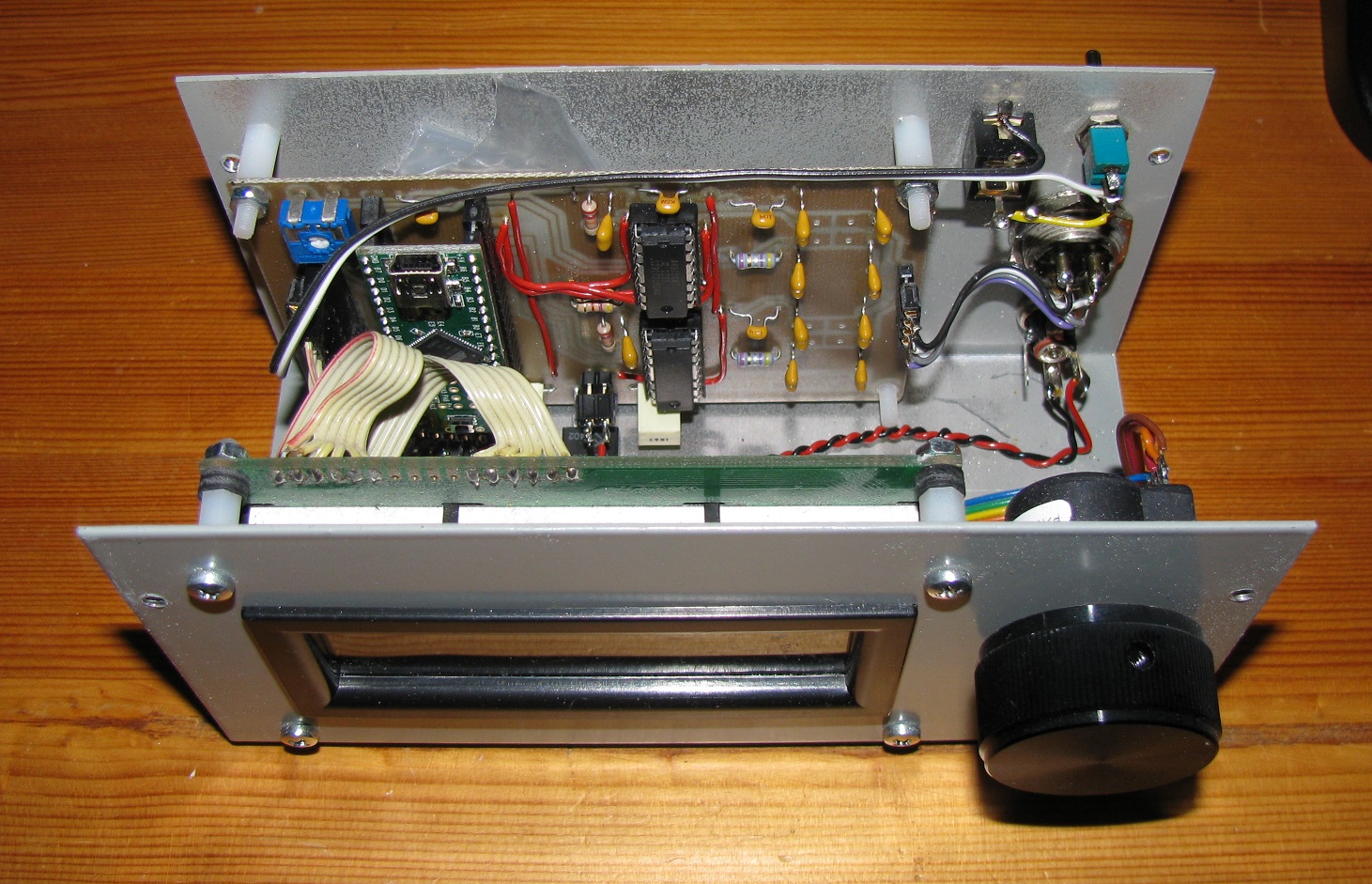 Whoops, the diagram indicates a 16x2 LCD.  I used a 20x4 LCD, although the output could just as easily be fitted onto a 16x2.  Anyway, the two Allegro A4975 ICs are the Stepper Motor Drivers, providing microsteps of 1/8th of a step.  With a 1.8 degree stepper motor ("Nema 17" variety purchased on eBay, 30 ohm coils), this provides for 1600 steps per revolution (approx  0.2 degrees per step).  When used with a 22 turn capacitor, this gives a fairly decent tuning resolution.